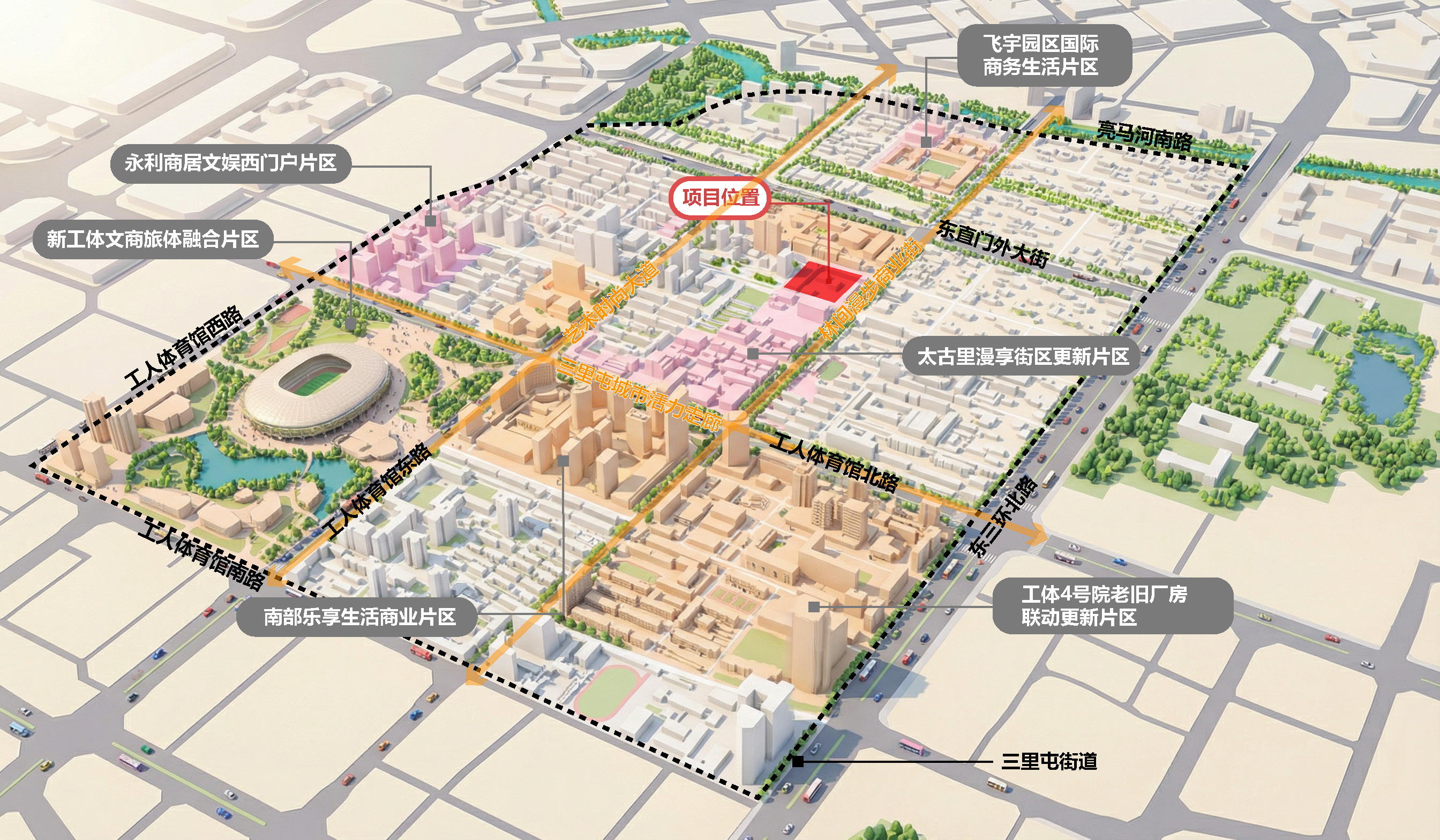 按照《朝阳区三里屯街道 CY00-0304、CY00-0305街区控制性详细规划(街区层面)(2021年-2035年)》,项目所处的街区功能定位为国际交流会客厅、文化交融区、高端商圈及新型商文体融合的城市活力中心。本次改造目标超越传统商业空间,构建集高端零售、文化展示、公共交流与绿色体验于一体的“未来城市商业范式”,助力国际消费中心城市建设。