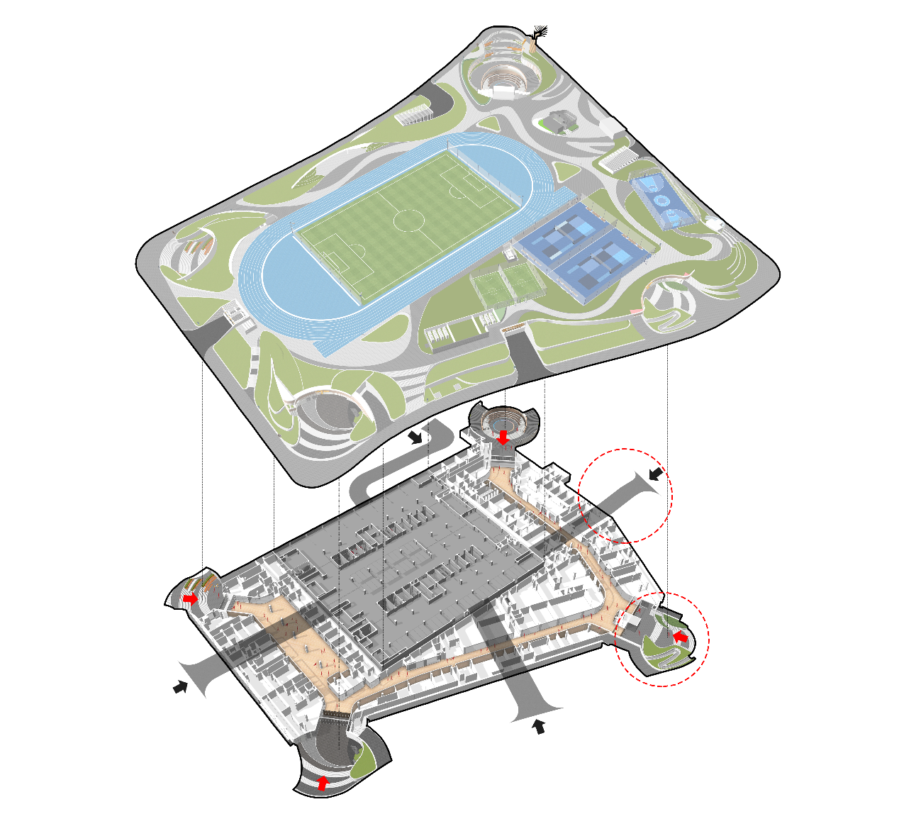 中建研科技充分发挥以设计牵引综合技术解决能力的优势,对项目的四大问题进行了一体化解决。针对建筑功能问题,项目团队以立体穿插方式组织地下增建停车和商业空间,以最小地下开挖量获得良好的经济性;针对城市机能问题,项目团队对地下车库交通与地面道路交通进行一体化分析与设计,通路治堵,全面提升出行安全感和体验感;针对空间品质问题,项目团队以建筑设计重塑城市空间和界面,为办公人群和周边居民提供优质运动休闲设施,打造新型城市节点;针对城市韧性问题,项目团队通过综合工程设计疏通整合城市地下行洪设施,提高城市安全韧性,助力泉城地下水资源保护。