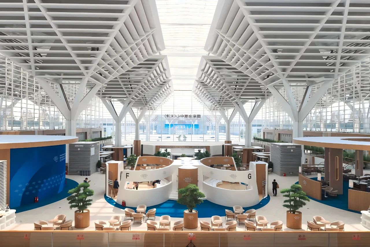国家会展中心(天津)是商务部与天津市人民政府合作共建的国家级战略工程,定位为服务京津冀协同发展,国际一流会展综合体。本项目是商务部继广州、上海之后,在全国布局的第三个国家级展馆,形成珠三角-长三角-环渤海三足鼎立格局。项目设置321.25万平米展厅,总布展面积55.8万平米,其中室内内净布展40万平米,室外布展15.8万平米,配套2.6万平米国家会议中心,可承接大型论坛和高端峰会。项目功能完备、配套齐全、交通顺畅,展厅全部为单层无柱结构、具有超强承载能力。在中国建研院及方案设计方德国gmp国际建筑设计有限公司等单位的共同努力下,项目建设响应可持续发展要求,应用地源热泵、屋面光伏、装配式建筑、智慧管理平台等88项绿色建筑技术,使场馆整体碳排放量较一般展览建筑锐减25%以上,取得绿色建筑三星级认证,并获得天津市第一批低碳(近零碳排放)示范项目称号,树立了特大型展览建筑综合体绿色发展新典范。作为本届盛会的主会场,国家会展中心(天津)以其卓越的绿色品质和前沿的环保技术,为这场聚焦全球经济的高端对话提供了世界级舞台。