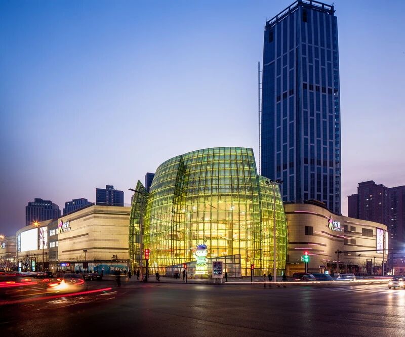 天津大悦城建成时是天津投资最大、体量最大、业态最全的一站式购物中心,是包括180米超高层国际甲级写字楼、高端精品公寓、高档住宅等多种业态的“城市综合体”。项目由中国建研院建筑设计院和美国RTKL建筑设计事务所联合设计完成。购物中心主体部分四层,局部五层,分为北端的时尚潮流馆和南端的青春活力馆,中间以独有的16米开阔的艺术创意连廊连通;共有店铺500余个,融合购物、餐饮、休闲、娱乐于一体。项目地理位置优越,方案设计特色突出,使用功能复杂,解决了超大型商业消防、地块交通、商业使用运营等一系列难点问题,成为天津市内核心区商业中心,其社会效益、经济效益显著。