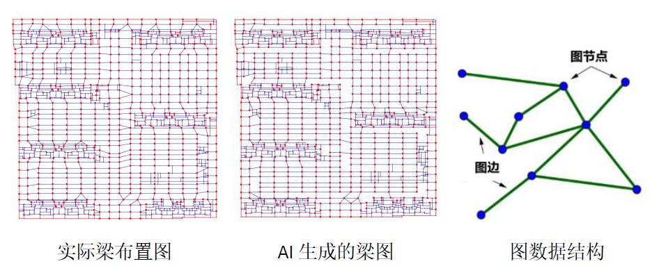中国建研院构力科技基于多年积累的工程项目案例,在结构设计领域应用AI的强大学习与拟合能力,引入了基于异构图的结构通用图谱表示方法。该方法将复杂的三维建筑结构用图数据结构来表示,其中图数据结构中的节点表示为梁、板、柱、墙构件,图数据结构中的边表示构件间的连接关系。
