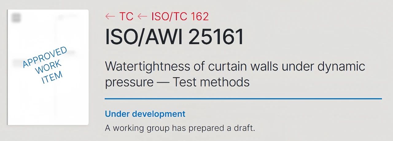 由中国建研院代表中国主导提出的国际标准ISOPWI25161Watertightnessofcurtainwallsunderdynamicpressure—Testmethods(《幕墙动态风压作用下水密性能检测方法》)正式立项。